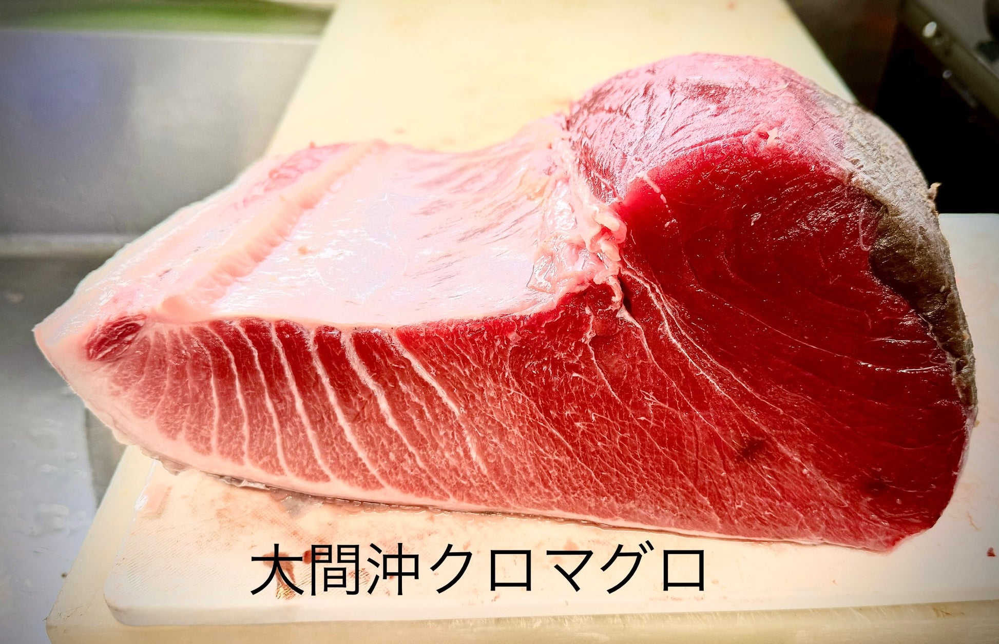大間沖水域で獲れたクロマグロ。あのアオリイカを好むこの水域のマグロは旨みは濃く、脂はスッキリ。津軽海峡の王者です。