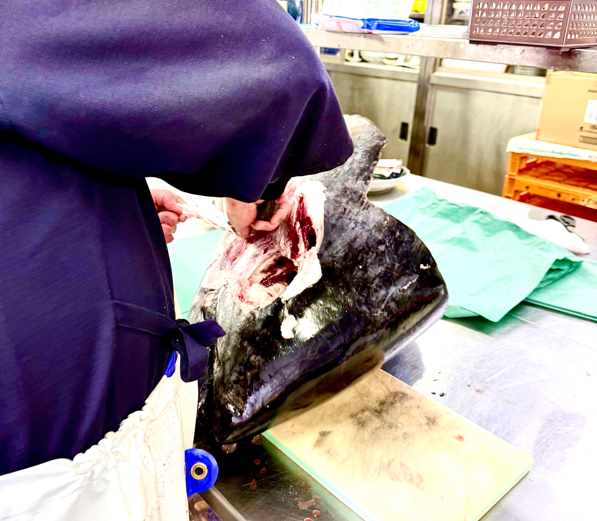 211kg大間クロマグロの脳天肉。頭部にある極めて希少な部位な頭肉です。通好みの味で、炙りにしたり、たたいてネギトロも良し!唐揚げやフライに天ぷら!創作料理の幅が広がること、間違いなし!