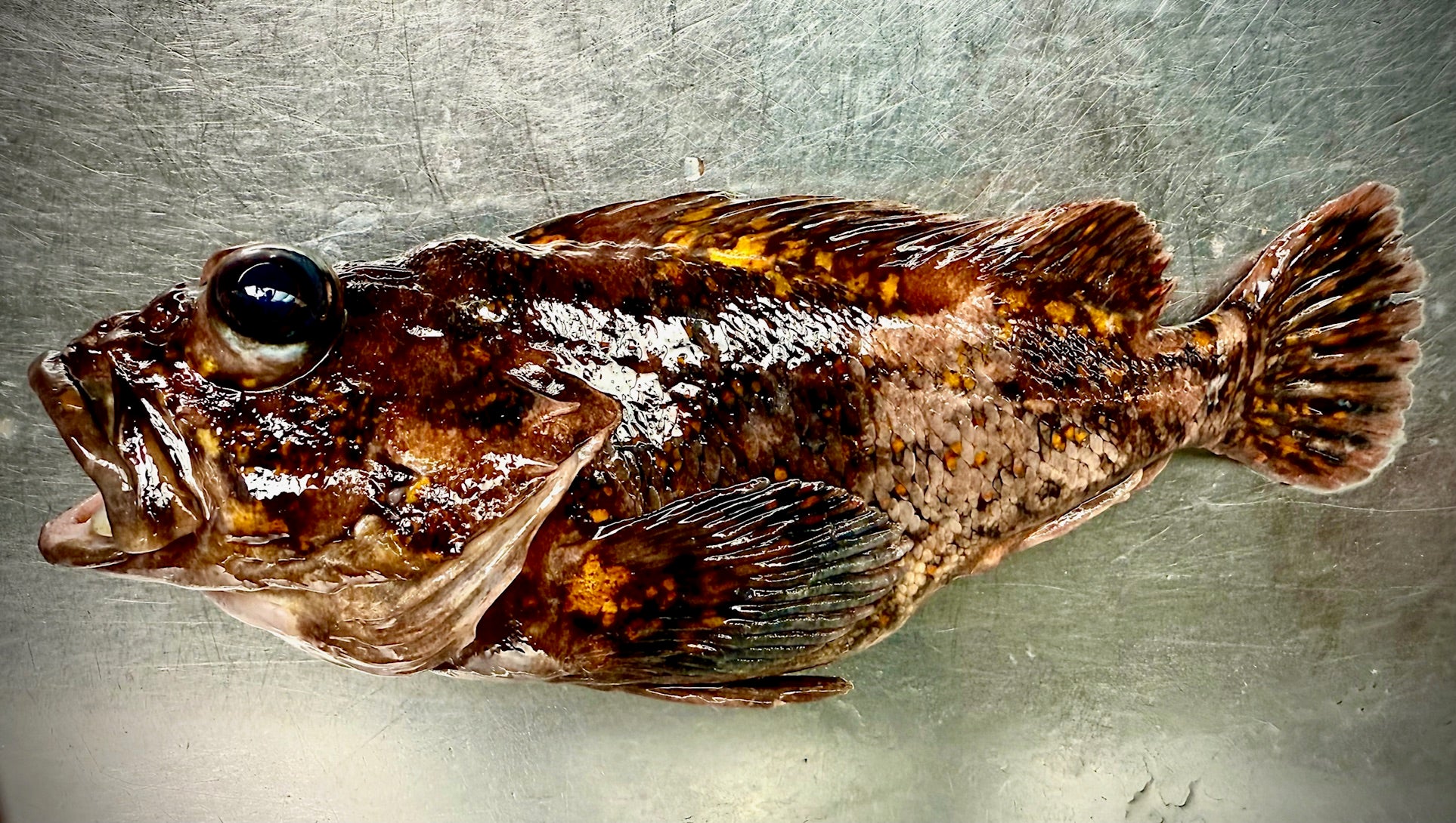 津軽海峡の珍根魚ムラソイ登場。皿からはみ出すサイズの尾頭付き。塩焼き、煮付け、から揚げにアクアパッツァ、もちろん刺身でも。獲りたてを−60℃の真空冷凍。(漁師さんがウロコと内臓をとってくれてます)