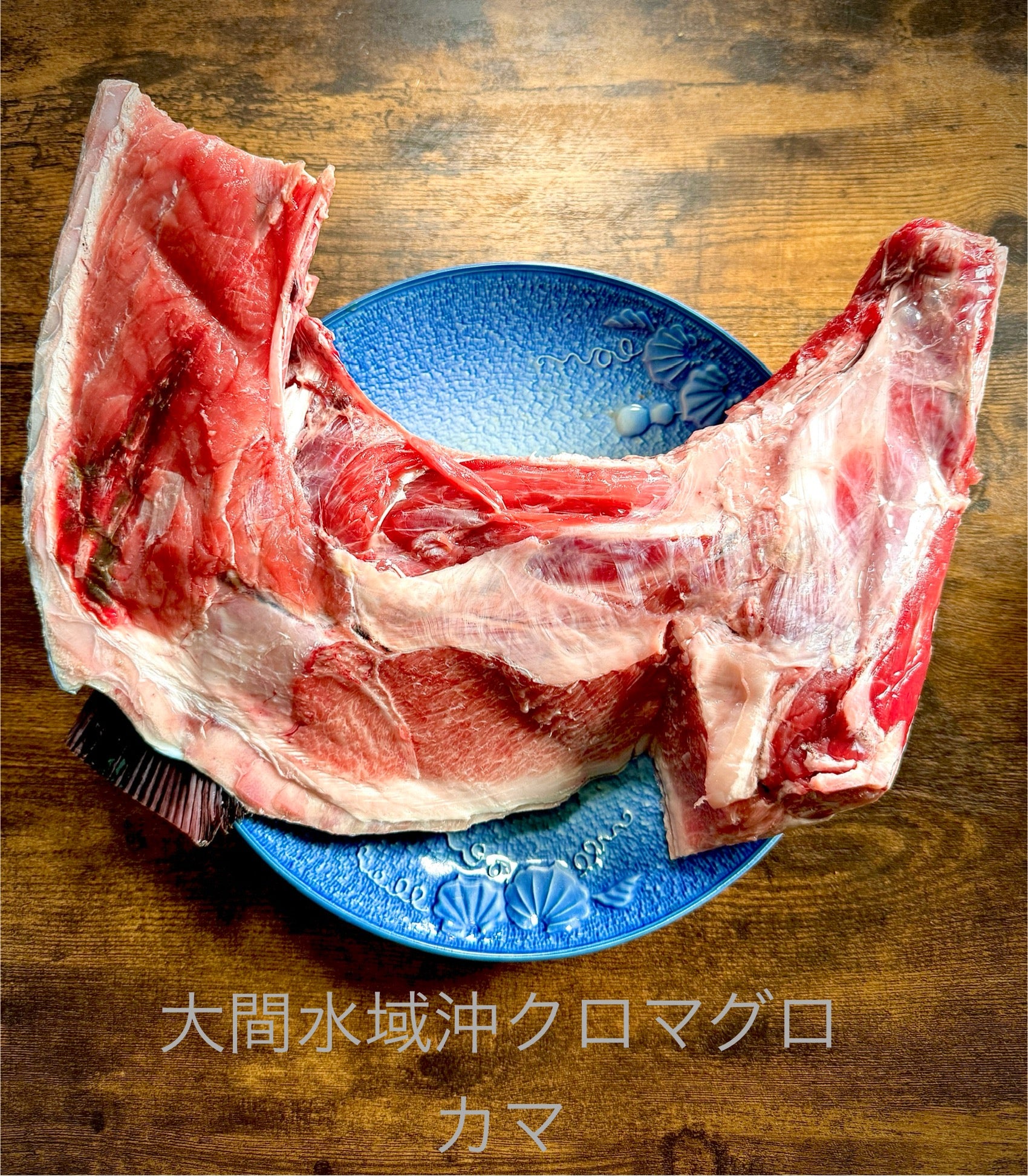 大間沖水域で獲れたクロマグロのカマ部。100kgクラスのマグロのカマはでかいです。のこぎりで切って調理してください。蒸してポン酢がおすすめです。もちろん、カマトロの刺身も希少価値💯です。